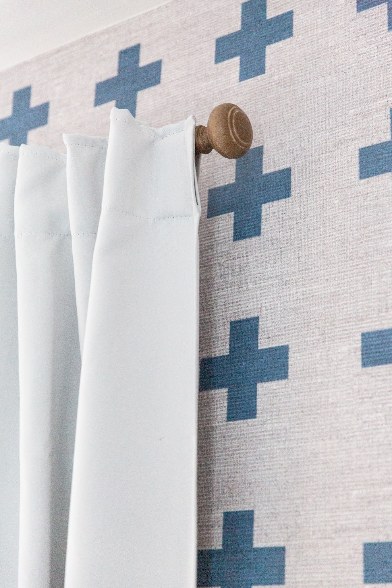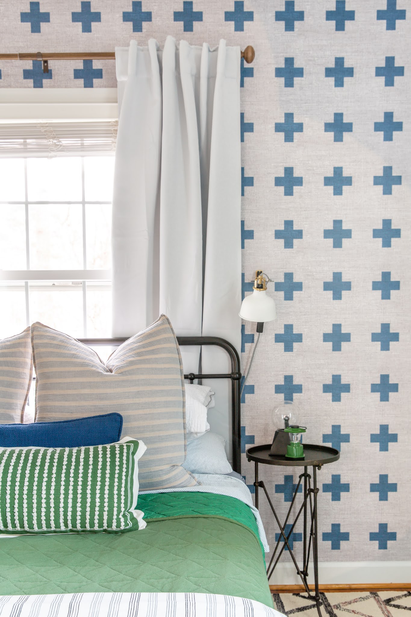 Swiss Cross wallpaper detail on his bed wall.